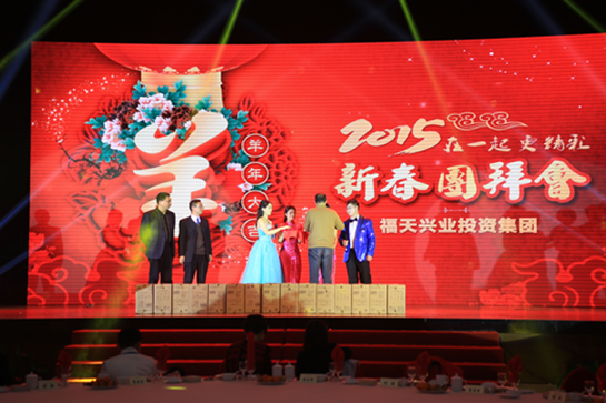 2015年 2月4日,福天兴业投资集团2014总结表彰暨2015年新春团拜会在长沙圣爵菲斯大酒店隆重举行。本次年会以“在一起,更精彩”为主题,寓意集团全体同仁团结一致,共同铸造集团的精彩与辉煌!集团全体领导、员工及外协单位嘉宾共800 余人参加了本次年会。